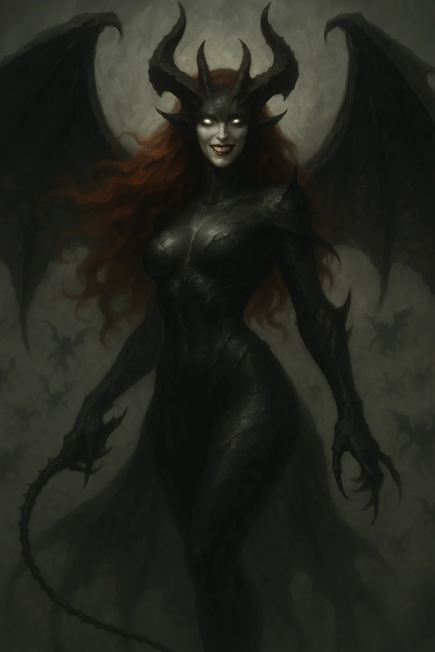 Lascivia's war form was that of a demonic feminine form 10 meters tall. Her skin was covered in a shadowy form of armor. Inky wings spread from her back. Black horns curved from her blackened, veiled forehead. She wielded a long, black, barbed whip.