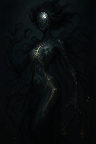Her true form was that of an Archdemon of the Void, a truly nightmarish creature. Her body is impossibly vast, stretching between spatial dimensions. Her face is that of a cracked, silver mirror that reflects the face of the viewer's truest love. From behind the mirror mask billows a cloud of inky black shadow like hair floating in water. Her feminine, shadowy body is wrapped around a humanoid skeleton. The shadows of her skin coalesce into images of closeness and intimacy, forms writhing and folding into each other. Tendrils of shadow spread from her body. Clasps, lockets, and other symbols of love dangle from the her shadows.