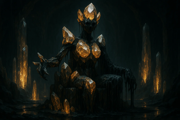 - Avatar Form: A massive creature of crystal and tar. Its head, shoulders, rib cage, hips, and left arm are made of jagged, cracked crystal that glows slightly. The rest of its body is formed of viscous tar connecting the crystal parts.