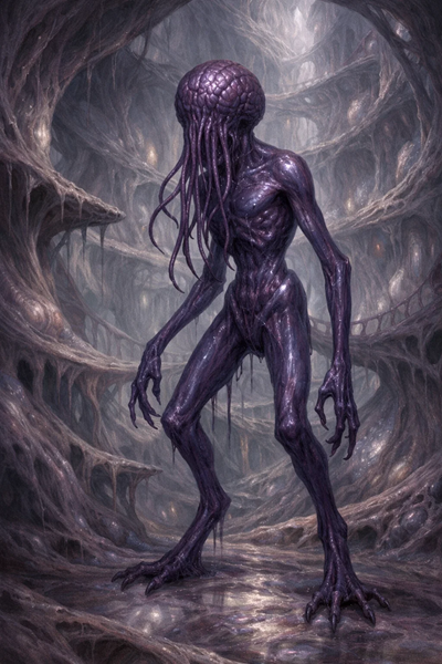 Thought Eaters are the most advanced biological manipulators among Eldritch species. They conduct magical biological research, reshaping flesh and mind with precise intent. Their laboratories consist of living structures, neural lattices, and suspended cerebral matter.