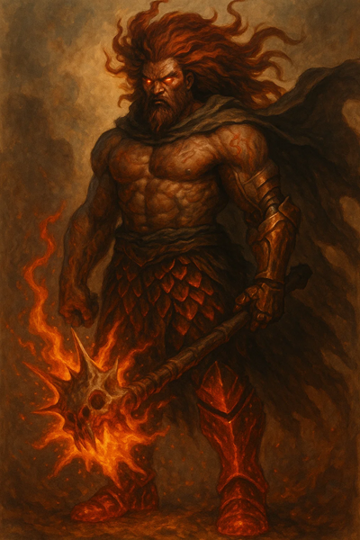 Thyr appeared as a massive, muscular, dark-bronze-skinned warrior with a mane of thick, dark red hair that flowed like a bonfire. His eyes shimmered with golden-red light. His arms were corded with muscle and bore ancient runes. He fought bare-chested, wearing a skirt of crimson scales and red-hot plated boots. A long flowing leather cloak wrapped around his neck drifted behind him on the wind. He wielded a weapon called Vrandrak, the Flamejaw, a flaming spiked bone hammer. After his battle with Skathi, he wore a prosthetic left arm made of runed bronze forged by Anyot's Exarch, Aedifica.