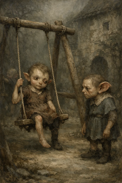 Offlings resemble short, misshapen elf-children, though they are neither children nor elves. No two Offlings are alike. Their bodies are defined by asymmetry: limbs too long or too short, faces pulled off-center, eyes and ears mismatched in size, and patchy, uneven hair.